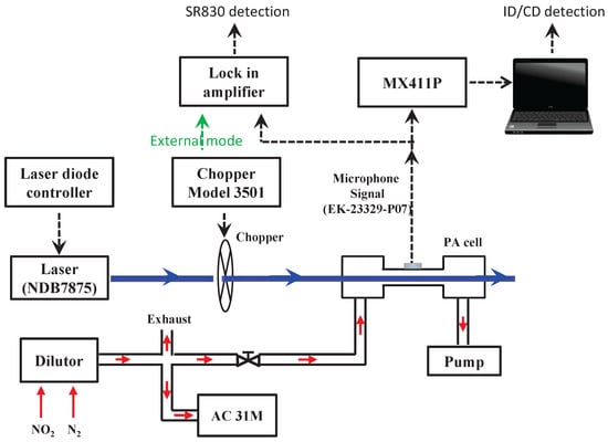 The detailed experimental set-up is shown in Figure 7. A high power laser diode (NDB7875, Nichia, Tokushima, JAPAN) operating at a wavelength of 444 nm is used as light source. The laser light, driven by a laser diode controller (6340, Arryo instrument, San Luis Obispo, CA, USA), is amplitude-modulated using a mechanical chopper (3501, New Focus, Inc., San Jose, CA, USA). The modulation frequency is matched to the fundamental longitudinal resonance frequency of the cylinder (in order to be an acoustic resonator) at 6260 Hz. Electric condenser microphones (EK-23329-P07, Knowels, Itasca, IL, USA) are used to record the acoustic signal in the PA cell.