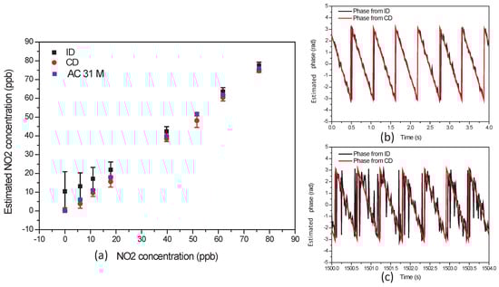(a) Estimated NO concentrations using ID and CD approaches with regards to the NO concentration measured by AC-31M analyzer. The error bars are the root mean square error between the AC-31M measurements and the estimates obtained with the ID or CD methods; (b) Observed and estimated phase delay for a NO concentration of 76 ppbv; (c) Observed and estimated phase delay for a NO concentration of 6 ppbv.
