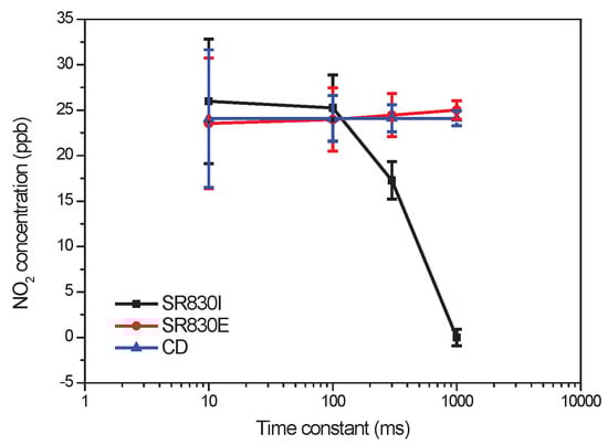 Figure 9 shows the experimental results for the measurement of a NO concentration of ppbv. We show in Figure 9 the assessments of the three different methods and several time constants. The mean value and the standard deviation (error bars) of each estimate are processed in an experimentation of 60 s. In this experiment the time constant Figure 9 is the period for SR830E and SR830I LIA. For CD implementation is fixed to s, is fixed to 1 s and the time constant (the abscissa Figure 9) is the period .