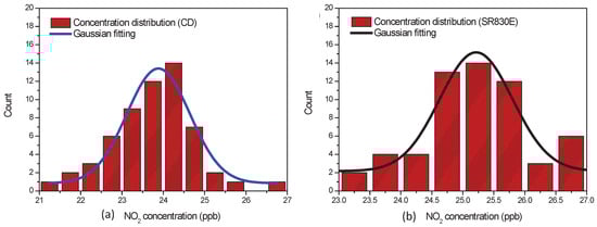 Figure 10a,b show the distribution histogram of the estimated NO concentrations by CD and SR830E LIA with a time constant of 1000 ms. The distribution histograms of the measured concentration are fitted to a Gaussian profile. The mean concentration of ppbv obtained by CD method results in an accuracy of ppbv (Figure 10a) with a precision of ppbv. The mean concentration obtained by the SR830E LIA shown in Figure 10b is pppv. Its measurement accuracy and precision are found to be ppbv and ppbv, respectively.