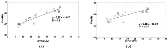In this section, the sensitivity of radar signals is discussed, for the case of two vegetation parameters: LAI and H. Figure 8 shows the relationship between the radar signals (VV and VH polarizations) and the LAI, for two moisture classes: mv ≤ 15 vol. % and mv > 15 vol. %. Just two moisture classes were proposed, in order to include a sufficiently large number of observations. In the VV polarization, the radar sensitivity to LAI leads to a dynamic range of approximately 2 dB in both moisture classes, with the signal decreasing with increasing LAI. This behavior is due to the fact that when the LAI increases, it leads to stronger vegetation-induced attenuation of the backscattered soil signals.