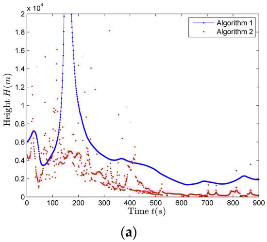 Figure 21a compares the height estimation results considering Algorithm 1, using (31), with the Algorithm 2, using (34). It can be seen that height estimation results of the Algorithm 2 are more concentrated and more stable. The histogram statistical results of the two algorithms are shown in Figure 21b,c, respectively. Comparing Figure 21b with Figure 21c, Algorithm 2 has better accuracy and more robust than the Algorithm 1, for the reason that Algorithm 2 has lower requirements on the accuracy of . The final height H (from aerial target to receiver) estimation result is 150 m, so the aerial target height is 125 m (the reference surface: the sea surface).