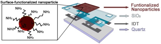 Due to the adverse effects of volatile organic solvents on humans, there has been an increasing need for developing new sensitive, low-cost and portable systems, which can respond in real time, for monitoring trace levels of volatiles in various environmental and industrial applications. Currently, there are some promising low-cost devices, with high sensitivity and low dimensionality known as chemical sensors, which are based on capacitive effects [8,9], resistive effects [10,11], optical fibers [12,13], field effect transistors (FETs) [14,15], surface acoustic waves (SAWs) [16,17] and quartz crystal microbalances (QCM) [18,19]. Among the SAW sensors, the Love-wave devices have generated great interest as gas sensors due to their potential to confine the wave energy in a thin guiding layer, provided that the velocity of the acoustic wave in the guiding layer is slower than that in the substrate, obtaining in this way a very high mass sensitivity. Commonly, a thin sensitive layer on the top of the structure can be used as an active medium that interacts with the environment but the energy is not confined in this layer [20]. In addition, in recent years, many of the sensors developed for specific applications in toxic chemical agent sensing, are based on nanomaterials. Nanostructured materials improve the sensitivity and velocity of the sensitive layer response due to their large ratio of surface area respect to their volume. Particularly, layers of nanoparticles are being used in SAW gas sensors and their high sensitivity to the gases has been demonstrated, although there are still few studies on this topic [21,22]. Moreover, nanoparticle surface can be improved by incorporating organic groups to its nanostructure, in order to obtain a higher affinity with defined gases. In this work surface-functionalized nanoparticles are proposed as high efficiency sensing layers for a Love-wave sensor, choosing amino-functionalized iron oxide nanoparticles because the amino group has a high reactivity, is a rich source of chemistry and can react with many chemicals with different intensity [23,24,25,26]. Different solvents used in the industry have been measured due to the good results obtained sensing N,N-dimethylformamide [26].