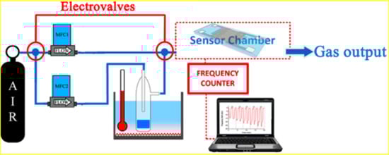 The concentrations of the different solvents, butanol, isopropanol, toluene and xylene were calculated using Antoine’s Equation [27]. The volatiles were diluted in synthetic air, controlled by a mass flow controller in order to achieve the desired concentration. The volume of each sample was 5 mL. It was kept at a constant temperature (4 °C) in a thermal bath for 30 min (headspace time) before being carried to the sensor chamber. Air flow in the chamber was 100 mL/min and the exposure and purge times were 5 min. The Love-wave sensor was integrated in an oscillator circuit that leads the oscillation with a specific frequency, which was used as output signal and read by a frequency counter. The experiment control and data acquisition in real time were implemented with a PC by means of a custom software. The experimental setup is shown in Figure 2.