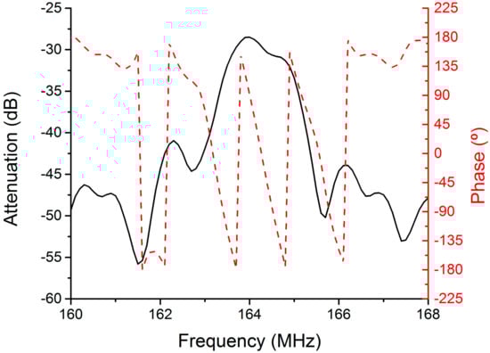 A 360B Automatic Network Analyzer (Wiltron), was used to characterize the Love-wave device coated with the functionalized iron oxide nanoparticles in RF range, where acoustic waves were propagated. The frequency response was recorded (Figure 3), resulting in an acoustic propagation wave centered about 164 MHz with a minimum attenuation (about 28 dB) of the transmission S21. In addition, a linear phase corresponding to principal acoustic propagation was observed, meaning that there was no parasitic interference in the signal transmission, getting a stable oscillation when the device was introduced into the amplifier loop.