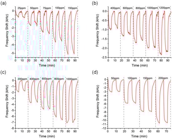 Each concentration was measured twice, obtaining high and repetitive responses of the sensor. In addition, different concentrations were detected, showing higher sensor responses for increasing concentration steps. Exposure and desorption times were fixed at 5 min for each solvent (Figure 4a–d).