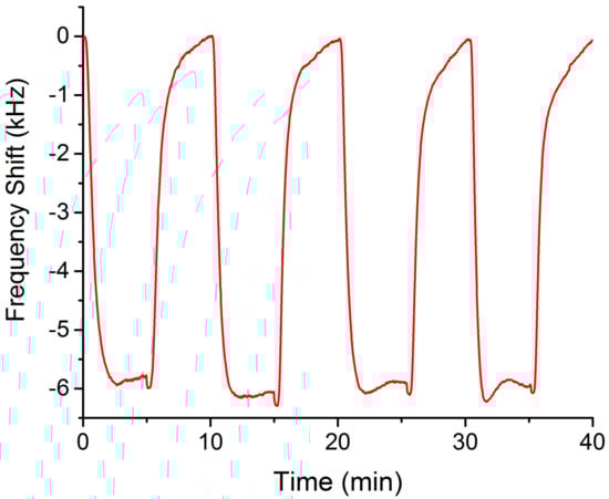 In the preset study a control test was carried out measuring two repetitions of 100 ppm of xylene (Figure 4) with a response average of 5840 Hz and a coefficient of variance of 2%. Six months before, xylene had been measured through four repetitions (Figure 5), in this case, the average of the response measurements was 5930 Hz. Therefore, the sensor showed long-term repeatability and reproducibility.