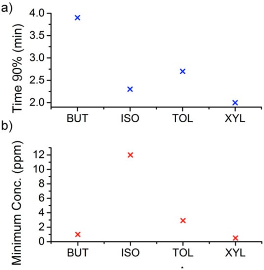 On the other hand, the lowest concentration measurements of the volatile organic solvents were considered to estimate the response time of sensor. The response time of sensor was defined as the time at which the device produced a signal change equal to 90% (τ90) of the complete magnitude of sensor signal (Figure 6a).