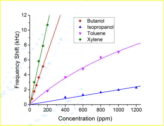 The sensor had a good linear correlation between the frequency shift and concentration in the case of butanol, isopropanol and xylene, however in the case of the toluene a Langmuir isotherm fit was more suitable [28], as it is shown in Figure 7.