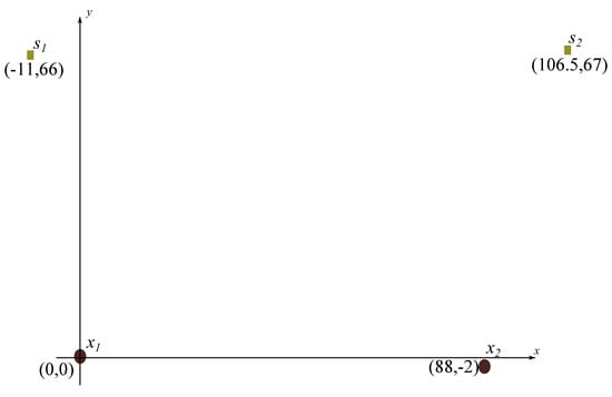 The positions of the antennas are chosen in such a way that the detected signal is in the far-field region of the PD electromagnetic activity. Figure 2 shows the positions of the antennas and sources used in the experiment, where and correspond to the monopole antennas with the positions indicated in Cartesian coordinates, and and are the test objects.