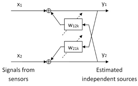 Schematic representation of the independent component analysis (ICA) algorithm. and are two recurrent filters whose coefficients are determined using an unsupervised learning rule.