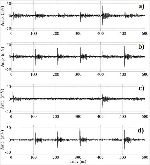 The test objects are excited with a high-voltage transformer at 6 kV obtaining controlled PD activity (see Figure 1). The electromagnetic radiation of PD will be detected and registered with UHF sensors located around the test objects. The sensors are two simple and inexpensive monopoles that have a resonant response at /4, being the wavelength of the main frequency. Setting the length to 10 cm ( is then 40 cm), the resonant frequencies are 750 MHz and its multiples, and it is possible to acquire all types of partial discharges at relatively far distances without the use of a wideband amplifier. The monopoles are connected to a Tektronix DPO7254 8-bit, 40 GS/s, 4-channel oscilloscope through coaxial cables with the same length.
