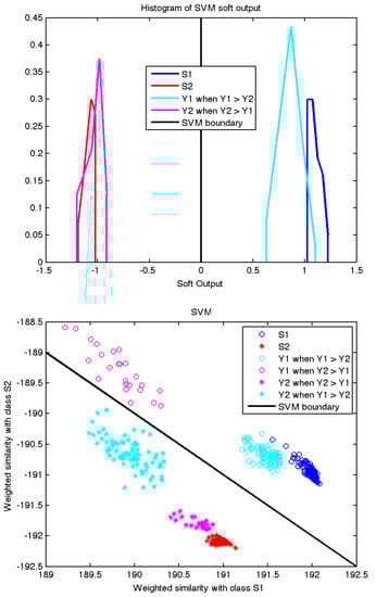 Finally, the scatter plots in Figure 6 and Figure 7 confirm the intuition that the signals recovered by ICA follow the same patterns as the training signals. Although the pulses labeled as Y1 when Y2 > Y1 are classified as belonging to the same class as training pulses S1, one can check how they are in fact residual signals not generated by source S1, because they lie far away from the points labeled as S1 in the plots (the distances in the plots are given by the kernel functions). Notice how the correctly classified pulses labeled Y1 when Y1 > Y2 do actually lie very close to the training labels in both scatter plots. The same applies to source S2 and pulses labeled Y2. Therefore, we can conclude that the signals recovered by ICA are sufficiently close in spectral envelope to those training signals directly recorded at the PD source and such validation is enough to accept the future results given by the proposed algorithm in other PD measurements.