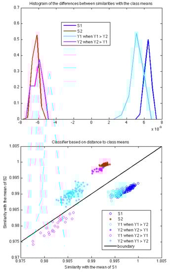 Figure 7 shows the analysis using as a classifier the difference between the similarities with the mean PSDs of each training class. This analysis completes the one performed by SVM in the following sense. The classification with the mean PSDs of each class focuses on the features that stress the similarities between instances in the same class (two instances appear to be of the same class when these features take similar values). However, the SVM classification focuses on the features that stress differences among samples of different classes (two instances from different classes would present different values with respect to these discriminating features).
