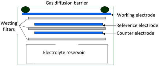 With advantages such as a stable working performance, long-service life, low-power consumption, high-sensitivity and rapid-response speed, the electrometrical gas sensor is well-suited for field quantitative detection of gases that are toxic at low concentrations and combustible gases [,]. ES also offers advantages such as small volume, simple operation and low cost, and has been widely used to conduct online monitoring in multiple fields, such as petrochemical industry, home automation, air quality monitoring, etc.