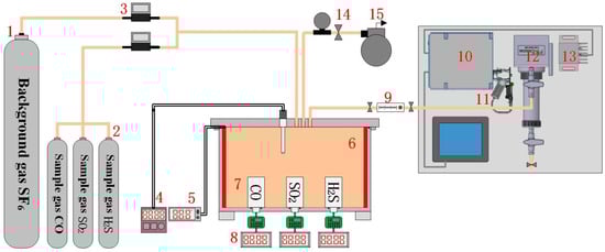 Test platform for electrochemical sensing. The label in the picture is indicated respectively as follows: 1. Background gas SF6; 2. Sample gas CO, SO2, H2S; 3. Mass flow controller; 4. Thermocouple; 5. Heating plate; 6. SF6 decomposition detection tank; 7. Electrochemical sensor; 8. Digital ammeter; 9. Glass rotameter; 10. Interferometer; 11. IR source; 12. Gas pool; 13. Detector; 14. Barometer; 15. Vacuum pump.
