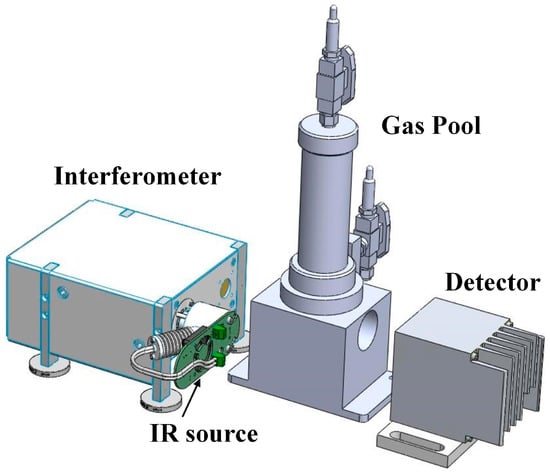 The FTIR detection system consists of an IR source, an interferometer module, a detector module and the gas pool, as shown in Figure 4 and Table A2. The IR source can emit 1–25 μm wavelength light, and the wavelength range can cover all the characteristic wavelengths for all measured gas components. The interferometer module is the key component and mediates the splitting and scanning of the IR light. The detector module is used to analyze the interference light containing the information from the measured gas; the model then obtains the gas component concentrations through IR spectroscopy.