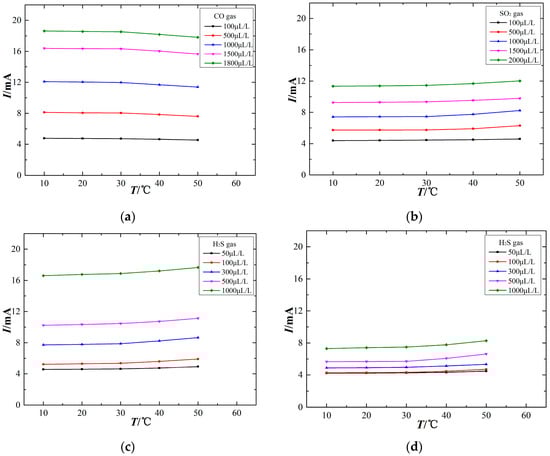 Temperature characteristics of the electrochemical sensors. (a) CO sensor, (b) SO2 sensor, (c) H2S sensor, (d) SO2 sensor (exposed to H2S).