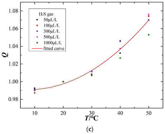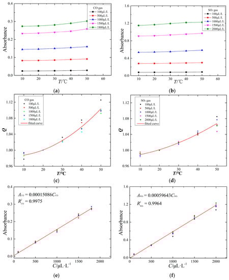 To further study the relationship between the temperature and IR absorbance of CO and SO2, the temperature compensation curves are fit by a quadratic fitting method, as shown in Figure 13c,d. The x-axis represents the ambient temperature (°C), and the Q of the y-axis represents the ratio of absorbance values at the measurement temperature and at 20 °C.