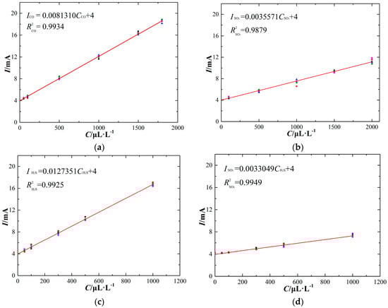 Linearity characteristics of the electrochemical sensors (at 20 °C). (a) CO sensor, (b) SO2 sensor, (c) H2S sensor, (d) SO2 sensor (exposed to H2S).