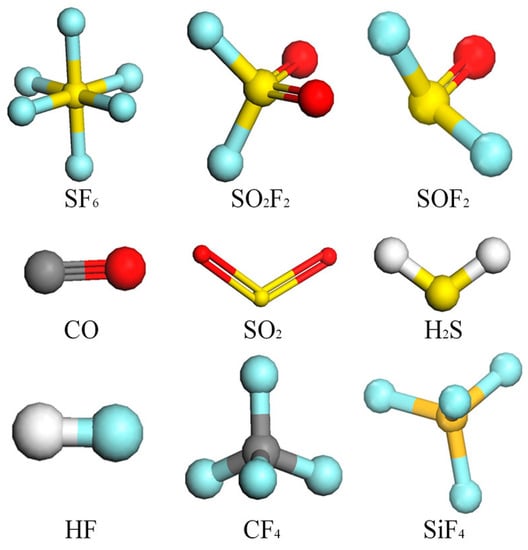 Material studio is used to simulate the IR absorption spectrum of SF6 and its decomposition products based on the molecular dynamics method []. The microstructure of different molecular molecules are first determined, as shown in Figure 8.