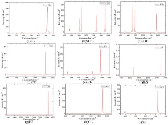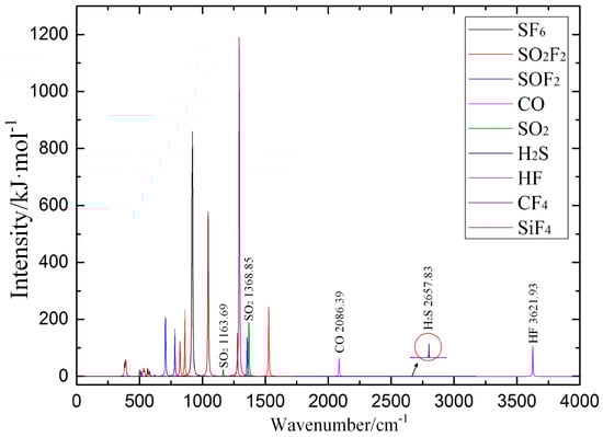 The calculated IR absorption spectroscopy of SF6 and its decomposition products is simulated, as shown in Figure 9. The simulation results show that the IR absorption of SF6 and its decomposition products is concentrated predominantly within the range of 300–4000 cm−1. Different gas molecules have different IR absorption peaks, and their corresponding absorption intensities also exhibit a large difference. In addition, a single gas molecule can have multiple absorption peaks.