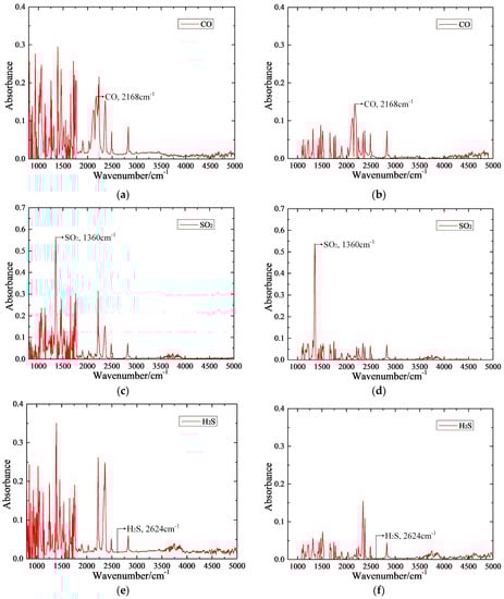 Pretreatment of the target gas IR spectrum. (a) CO before pretreating, (b) CO after pretreating, (c) SO2 before pretreating, (d) SO2 after pretreating, (e) H2S before pretreating, (f) H2S after pretreating.