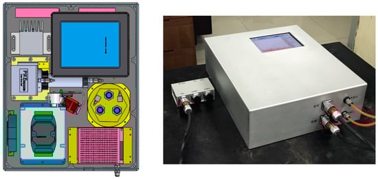 A SF6 decomposition detector was designed and manufactured by combining electrochemical sensors and IR spectroscopy, as shown in Figure 14. The volume of this detector is 460 mm × 380 mm × 132 mm, and the weight is 25 kg. Furthermore, there are several features for the developed SF6 decomposition detector in this paper. First of all, using ES-IR comprehensive detection method and cross interference technique, the gas composition and concentration of SF6 decomposition products could be analyzed accurately and fast, which meets the requirements of on-site monitoring. Secondly, temperature monitoring module is also installed inside the detector, then temperature compensation method is used to reduce the influence of ambient temperature on the measurement results and ensure the accuracy of the measurement results. Thirdly, pneumatic control module is applied to the detector to make the internal sensors work under the suitable condition of about 1 MPa gas pressure, which further ensures the veracity and reliability of test results.