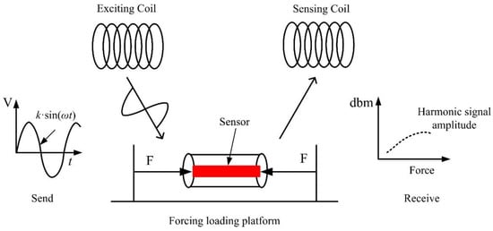 The graphical representation of the experiment is shown in Figure 5. The two coils are the exciting coil and sensing coil, respectively. The dimension of the exciting coil is 110 mm in diameter and 200 turns in length. The copper line used in the exciting coil is 0.5 mm in diameter. The dimension of the sensing coil is 90 mm in diameter and 200 turns in length. The copper line used in the sensing coil is 0.25 mm in diameter. The exciting coils generated alternating magnetic fields under the excitation of external sinusoidal sources. The sensor suffered from strain in the alternating magnetic field and generated an inverse magnetostriction effect, which resulted in the magnetic flux variation in the sensing coil. The sensing coil was linked to a spectrum analyzer to acquire the changing signals. The analyzed results were stored in a computer.