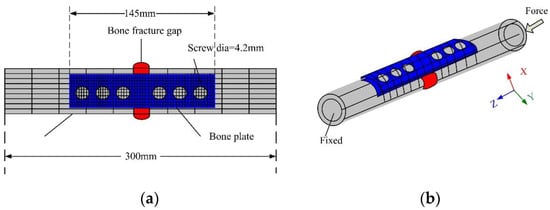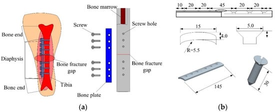 The tibia had a length of 300 mm and a diameter of 30 mm. The 2 mm wide transection thin layer represented the bone fracture. A commercially available non-locking compression bone plate (Model: 6-145-4, Huachuang Medical Apparatus & Instruments Inc., Guangzhou, China) with six holes was modeled and assembled with bone fragments with the help of six screws. The bone plate bridged the bone fragments and maintained enough space between the screws and fracture site to prevent interaction with injured tissues [20]. The detailed dimensions of bone plate and screws are given in Figure 2.