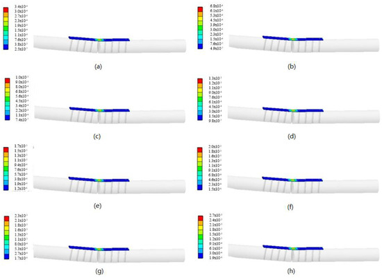 Strain distribution diagrams under different forces. (a) F = 50 N; (b) F = 100 N; (c) F = 150 N; (d) F = 200 N; (e) F = 250 N; (f) F = 300 N; (g) F = 350 N; (h) F = 400 N.