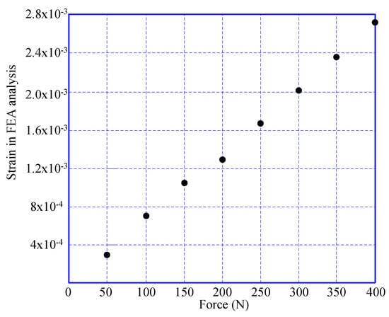 The supporting force provided by the bone plate decreased gradually as the tibia fracture healed itself from the FEA analysis. In order to simulate the change in the bone strain during the bone healing accurately, a force was exerted on the sensor, as shown in Figure 3. The force was evenly loaded at intervals of 50 N and the force range was 0–400 N (the goat in the experiment had a weight of about 40 kg). The material attributes of the TBS model are given in Table 1. Compressive strain distribution diagrams are illustrated in Figure 6. Figure 7 sketches the relationship between the external force and strain of the bone plate. It could be concluded that the strain in the bone plate increased gradually as the external force rose. In other words, the bone plate suffered from a larger strain at the early stage of the bone healing due to weak connections of the bone fracture region. After some time, the strain of the bone plate decreased step by step because the bone became stronger as it healed. This provides evidence that could be used aid in monitoring bone healing.