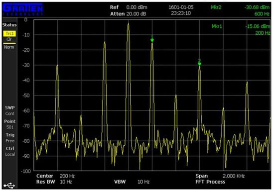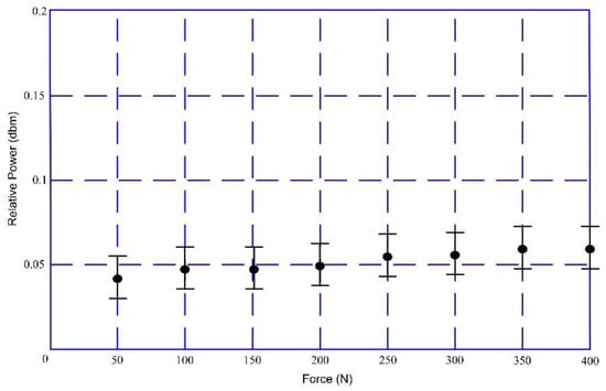 A sinusoidal signal with a frequency of 200 Hz and a voltage of 4 V was generated by a function generator (Fluke 271). The sinusoidal signal was used as the input into the exciting coil after a power amplifier (TAPCO JuiceTM) was used to generate alternating magnetic fields. An external force was applied on the goat hindquarter tibia through the loading platform at even internals of 50 N. The force range was also 0–400 N. The bone plate withstood a compressive strain as the force exerted on bone became larger, which resulted in a strain on the magnetostriction material and a change in magnetic permeability accordingly. The magnetic permeability variation could be detected by the sensing coil. The analysis results by the spectrum analyzer (GA40XX) is depicted in Figure 8. From the results, we found that the 3rd harmonic frequency (600 Hz) had a larger amplitude and a more stable performance in the experiment. Hence, the 600 Hz harmonic frequency was selected as the detecting frequency for our experiment. Figure 9 shows the relationship between the external force and the powers of the detected 3rd harmonic signals. The power of the selected frequency increased as the external force became larger. Essentially, the strain on the bone plate increased at the same time. This allows for judgement of the bone healing state. After the force was 300 N, the output of the sensing coil did not change with the external force as the magnetostriction materials gradually became saturated (the saturation magnetostriction of the sensor is 12 ppm).