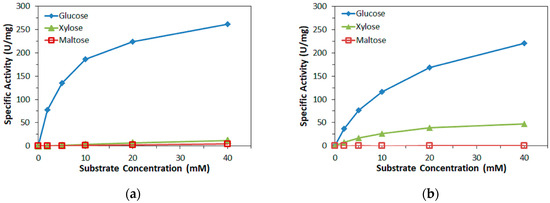 Dependency of specific activity on the concentration of three mono- and disaccharides for two FAD-dependent glucose dehydrogenases (FADGDHs). (a) bacterial FADGDH (FADGDHγαβ(QY)), (b) fungal FADGDH (AfGDH).