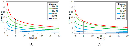 The principle of the measurements here is that of most commercial SMBG meters. In these types of measurements, the enzyme, mediator, and analyte react in a μL-scale volume. The potential is applied after the enzyme reaction reaches its equilibrium. The response current follows the Cottrell equation, and is an indicator for the concentration of the reduced mediator at equilibrium. Typically, the response current decays initially and reaches a steady plateau after several seconds [4,15,16] Corresponding time courses were recorded with ferricyanide and with hexaammineruthenium(III) as mediator.
