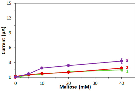 Dependency of current at 5 s after application of the potential on the maltose concentration. Enzyme: FADGDHγαβ(QY). Mediator: (1) 100 mM mPMS, (2) 100 mM ferricyanide, (3) 100 mM hexaammineruthenium(III).