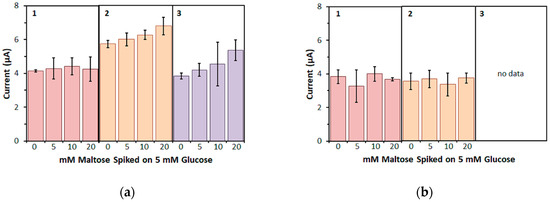 Response current to 5 mM glucose spiked with different amounts of maltose. Enzyme: (a) FADGDHγαβ(QY), (b) AfGDH. Mediator: (1) 100 mM mPMS, (2) 100 mM ferricyanide, (3) 100 mM hexaammineruthenium(III).