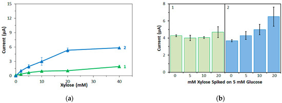 First, corresponding measurements were also carried out with xylose and with mPMS as mediator, again with the same amounts of enzyme on the electrodes as were used for the glucose measurements. The response currents are plotted against the xylose concentration in Figure 6a for both enzymes. Again, to investigate the influence of xylose on the measurement of glucose, a physiological glucose concentration (5 mM) was spiked with several concentrations of xylose (Figure 6b).