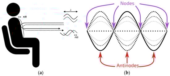 (a) Doppler effect: according to the Doppler effect, the phase change Δθ(t) of the reflected signal is proportional to motion of the measured location, scaled by wavelength of the signal Δθ(t)= 4πΔx(t)/λ, where Δx(t) is the chest displacement and λ is the wavelength of the transmitted signal; (b) Standing wave: the figure shows a possible sinusoidal standing wave. The different lines show the standing wave at different moments in time.