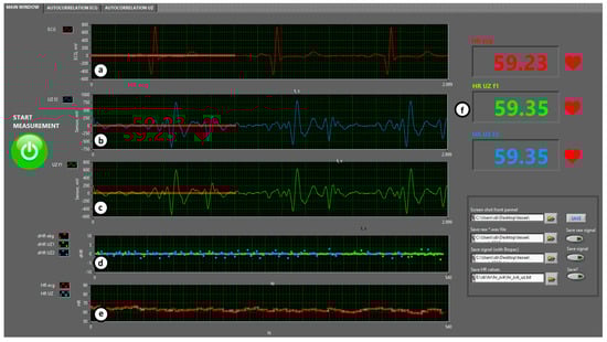 Front panel of the dedicated LabVIEW user interface: (a) reference III-Lead ECG signal; (b) processed ultrasound signal at f1 = 40 kHz; (c) processed ultrasound signal at f2 = 39 kHz. Note that US signals are delayed compared to ECG signal for about 200 ms because of the type and place of measurement; (d) measuring error, i.e., difference between the reference signal and experimental method signal instantaneous HR displayed on a diagram; (e) diagram of instantaneous HR of the two methods in question and (f) numerical display of instantaneous HR of all three signals.