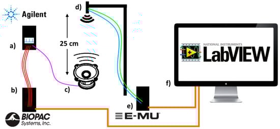 Test signal experiment consisting of (a) Agilent signal generator, generating a pulse signal with 0.5% duty cycle. The generated signal was connected to (b) Biopac ECG commercially available III-lead ECG system and (c) a standard speaker. The membrane of the speaker vibrated with the selected frequency (0.75 Hz to 3.6 Hz), mimicking a human torso. At the distance of 25 cm; (d) US transducers recorder the speaker signal via the (e) E-MU 24-bit/192 kHz A/D converter. Both acquired signals were analyzed by the (f) LabVIEW software.