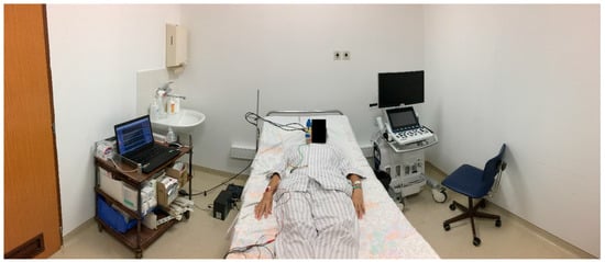 The second part of the experiment was carried out in a controlled environment in a laboratory at the Faculty of Electrical Engineering, University of Ljubljana. The environmental conditions were controlled to be at the same level for all participants. The laboratory experiment was split in two parts. During the first part, the volunteers were laid on the bed and were asked to remain as relaxed as possible, to breathe in a calm manner and to minimize any movement in the neck area, e.g., speaking, swallowing, etc. The second part was carried out after 1 min of physical activity, during which the participants were doing squats, pushups or abs. Afterwards the volunteer was asked to return to bed and received the same instructions as in the first part. Measurements in both cases were conducted in a five minute interval. The two ultrasound transducers (one emitter and one receiver) were installed to a special holder at a distance of 25 cm from the subject’s neck. The beam of the ultrasound sensor was aimed to record the area around the external jugular vein. For the optimal sensing conditions, each subject was asked to tilt their head towards their left shoulder and expose the jugular vein. The ultrasound signal was continuously recorded by the E-MU 0404 device. The ECG electrodes were positioned to the subject’s left and right arm and the left leg. The signals from the electrode were continuously sampled by the Biopac MP150 acquisition system in combination with the ECG100C biopotential amplifier. The acquired signals were forwarded to a custom designed PC LabVIEW application.