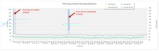 The results obtained within the experiment prove the possibility of non-contact measurement of heart physiological parameters on healthy subjects in a controlled laboratory environment with low electromagnetic noise and no sudden environment changes (temperature, humidity, noise, etc.). Even though the method required subjects to remain as still as possible throughout the duration of the measurement, the results also show that it is possible to perform measurements after physical activity, causing subjects to breathe through their mouth and swallow saliva more often than usual. Based on the measured signals it is possible to distinguish between disturbances and the physiological signal and furthermore filter out the noise. For the purpose of this paper, such noise was deliberately deleted from the both, experimental and reference recording in order to compare them in most objective manner. The percentage of deleted signal is provided in Table 2 and was between 2% and 17%, with the average value of the discarded signal at 6.8%. The actual percentage of the disposed signal was mostly caused by repeated swallowing of saliva and unwanted movement of the volunteer’s neck area. As minute movement signals resulting from vein contraction due to heart beat are measured, any such movement caused relatively large displacement of the sensor’s measuring position and, consequently, an unusable part of the signal. Instead of deleting the part of unusable signal, it could also be altered to correspond to the reference signal or the calculated moving average in points of maximum difference.