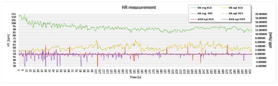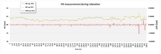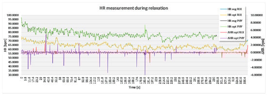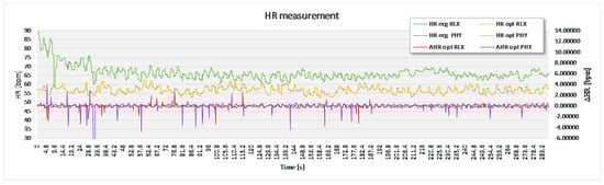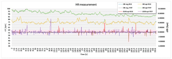 The analysis based on the filtered signals of laboratory measurements for the five volunteers are provided in Table 2, Table 3, Table 4, Table 5 and Table 6. Also, the complete course of the recording for each subject is drawn in Figure 8, Figure 9, Figure 10, Figure 11 and Figure 12 (i.e., reference signal compared to experimental signal along with the difference between them for each interval). Each figure represents the signals measured during the relaxation period as well as the signals recorded after 1 min of physical activity. Note that the Figure 8, Figure 9, Figure 10, Figure 11 and Figure 12 only show the optimal signal compared to the reference one. In contrast, statistical analysis in Table 2, Table 3, Table 4, Table 5 and Table 6 include all instantaneous values, therefore the standard deviation is relatively high.
