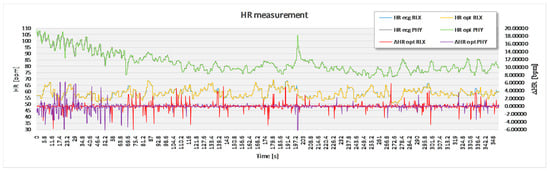 Within the clinical part of the experiment, we conducted the measurement on a group of individuals, male and female, aged between 61 and 82 years. Each of the patients was diagnosed with a specific cardiac pathology. As measurements were done in real-life conditions, also more distractions were noticed, mainly noise created by people on the hall outside the experiment room talking, and from passing of other patients on foot, wheelchairs or being transported inside their hospital beds. Table 8 and Table 9 and Figure 14 demonstrate an example of results performed on a volunteer. This specific patient was diagnosed with atrial fibrillation with bradycardia ventricular response.