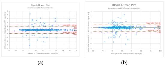 With the purpose of validating the experimental method (after filtering out the known disturbances) against the reference one, Figure 13 represents a Bland-Altman plot example for a measurement conducted on an individual during relaxation (Figure 13a) and after 1 min of physical activity (Figure 13b). The comparison is done based on the calculation of instantaneous HR between the optimal US signal obtained with the moving average (therefore no ECG as a reference point) and the ground truth ECG signal. Over 1500 values of instantaneous HR are calculated, depending on percentage of ejected signal. In the first case, 95.6% of the signal is within the level of acceptance (LOA), whereas in the second case 94.9% of the signal is within the LOA.