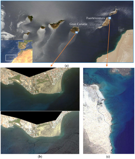 The study area selected is the Canary Islands (Spain), off the northwest African coast. Particularly, shallow coastal ecosystems with clear waters and easy access for the collection of field data, as shown in Figure 1. Specifically, the littoral protected zones selected are: Maspalomas, in the south part of Gran Canaria Island and Corralejo-Lobos Island (Fuerteventura Island), as shown in Figure 1b,c, respectively.