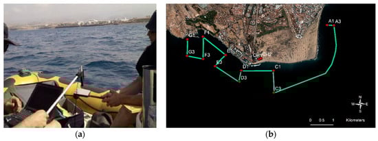 Likewise, the water quality of the Maspalomas shallow coastal ecosystem has been sampled in order to obtain chlorophyll-a, turbidity and CDOM concentrations and to collect seafloor information, specifically bathymetry and benthic habitats, a digital echosounder, video records and a differential GPS receiver were used. Figure 2b shows the geographic location of the in-situ transects and sampling sites, during the Maspalomas oceanographic campaign of 4 June 2015 (similar locations were sampled during 11 August 2013).