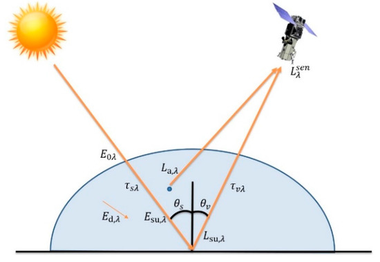 As it can be seen in Figure 3, is the radiance received by the satellite, is the radiance contribution by the atmospheric dispersion for the band of wavelength , is the distance between the Earth and the Sun, is the atmospheric transmissivity for the upward flow, is the solar irradiance at the top of the atmosphere, is the angle of the incident flux formed between the vertical and the solar rays, is the atmospheric transmissivity that the solar radiation crosses in the downward direction and is the diffuse irradiance, as a consequence of the scattering and that depends on the conditions of the atmosphere.