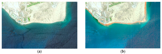 To overcome this problem, Martin et al., 2016 [28] proposed to integrate the sunglint removal algorithm in the radiative transfer model to estimate the contribution of the NIR reflectance of coastal waters, which will allow us to eliminate this contribution of the specular NIR reflectance. As an example, Figure 4 shows a color composite image before and after the sunglint contamination removal. After sunglint elimination, bright spots distributed along the wave edge basically disappear and the seafloor becomes much clearer (i.e., seagrass patches in the upper right side of the image). In this example of combined atmospheric-deglinting methodology, the atmospheric correction of the eight WV-2 bands using the 6S model has been applied [11].